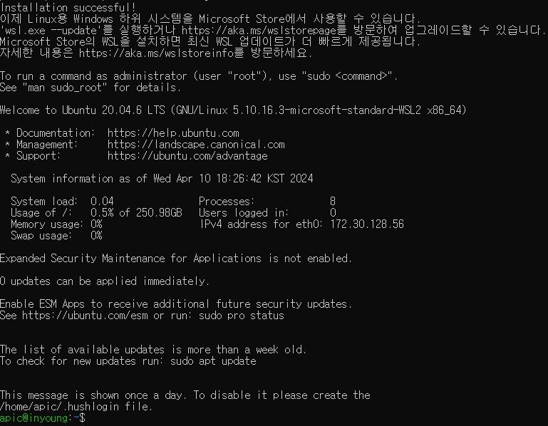 그리고 아래의 명령어를 수행하여 ubuntu를 설치한다.