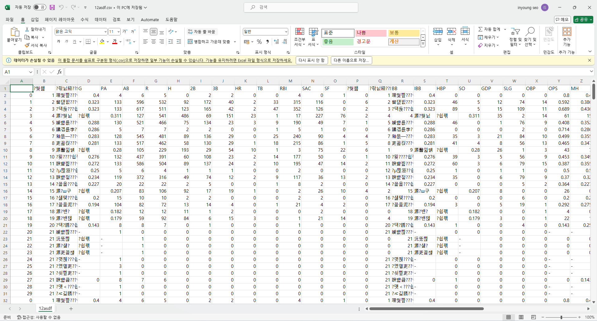 하지만 파일을 열어보니 한글이 깨져있었다.