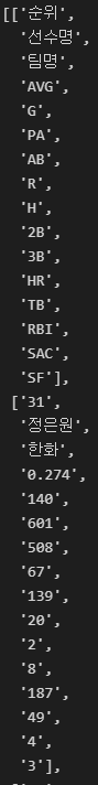먼저 해당 페이지에서 선수 기록 테이블을 찾고 출력해본다.