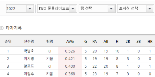 먼저 해당 드롭박스를 선택하고 KBO 정규시즌을 선택한다.