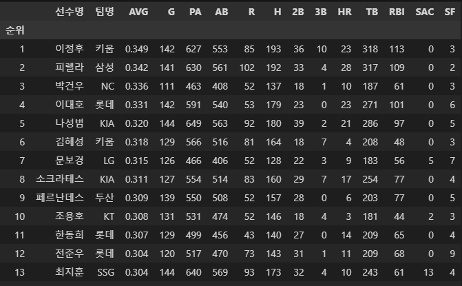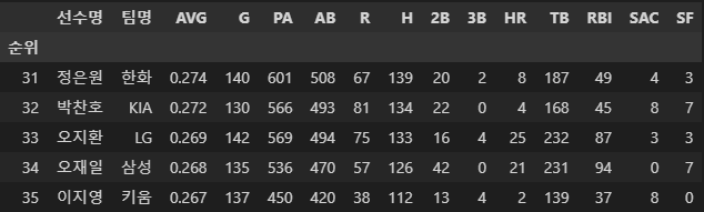 driver.get('https://www.koreabaseball.com/Record/Player/HitterBasic/BasicOld.aspx?sort=HRA_RT')
