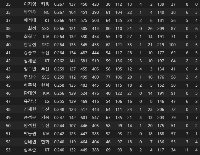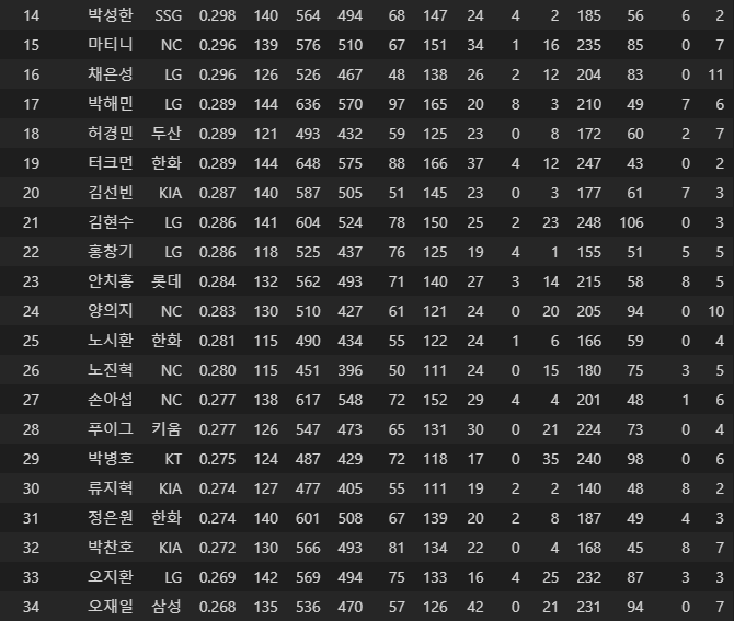 그럼 이렇게 선수 한 명당 한 줄이며, 데이터 하나하나가 분리된 것을 볼 수 있다.
