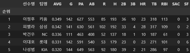 하지만 그 전에 그냥 저렇게 코드를 실행시키면 정규시즌 성적이 아닌 그 전인 플레이오프 성적이 나오는데 그 이유는